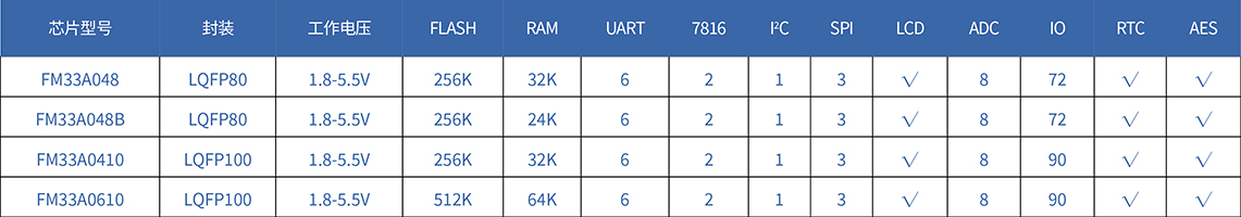 上海復(fù)旦微電子集團(tuán)股份有限公司智能電表MCU包括32位Cortex-M0內(nèi)核FM33A0xx/FM33A0xxB系列芯片及16位增強(qiáng)型8xC251內(nèi)核FM33xx系列芯片。最大支持512KB FLASH程序存儲器和 64KB RAM,并集成LCD驅(qū)動(dòng)、帶溫補(bǔ)的RTC、ADC、AES以及UART、I2C、SPI、7816等通用外設(shè)接口。