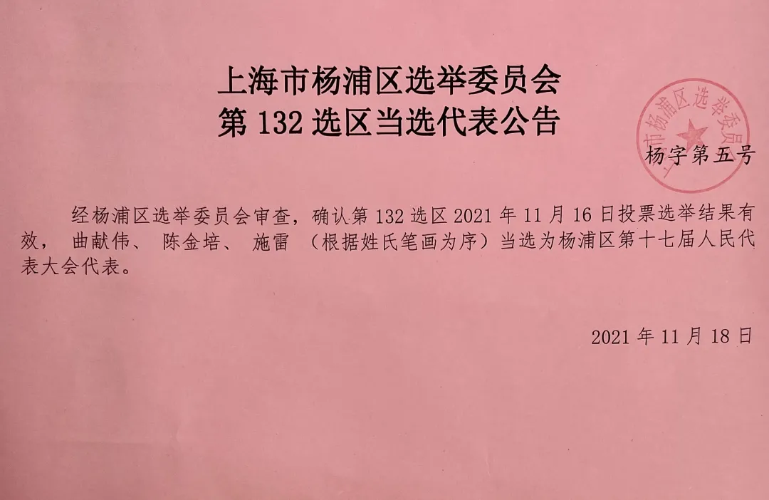 經楊浦區(qū)選舉委員會審查,確認第132選區(qū)2021年11月16日投票選舉結果有效,上海復旦微電子集團股份有限公司董事總經理施雷當選為楊浦區(qū)第十七屆人民代表大會代表。